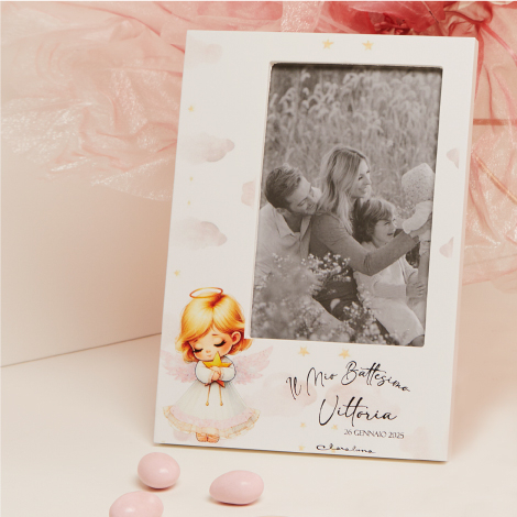 Questo elegante portafoto, decorato con un tenero angioletto, è l’idea bomboniera ideale per il battesimo. Personalizzabile con il nome o la data dell’evento, diventa un ricordo speciale da regalare a familiari e amici. Con il suo design delicato, il portafoto custodisce i momenti più preziosi e dona un tocco di dolcezza a qualsiasi ambiente. Un regalo unico che accompagnerà nel tempo la memoria di un giorno indimenticabile.