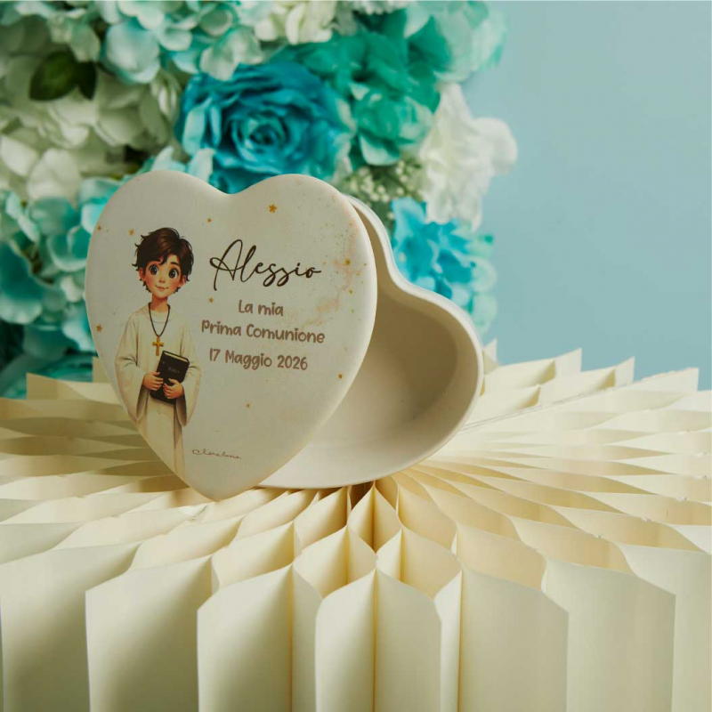 Celebrala prima comunione del tuo bimbo, con una scatolina bianca decorata con un dolce bimbo