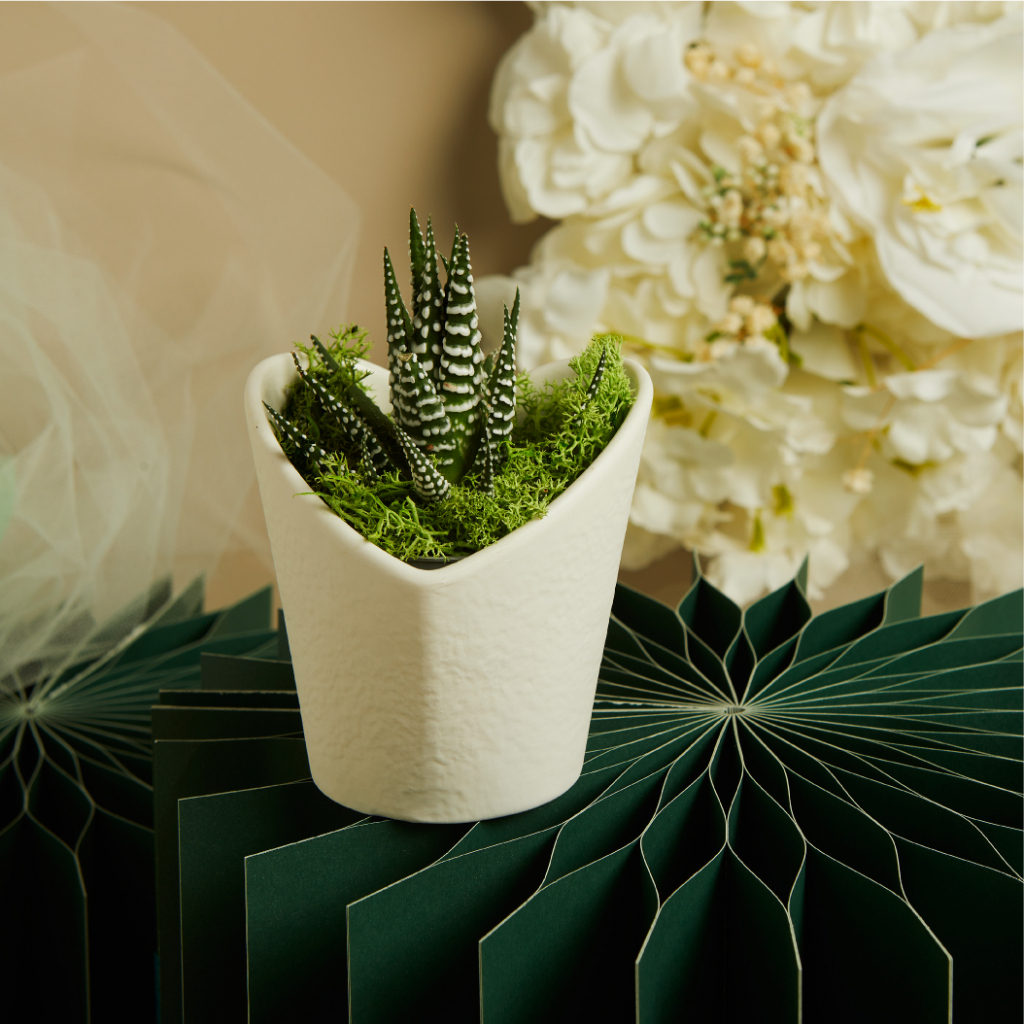 VASETTO BIANCO CUORE CON PIANTINA E MUSCHIO 9.8X9.5X9.6 CM SCATOLA PIANTINA 13X14.5X13 CM