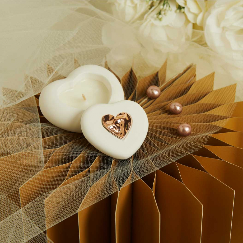26291CAND/BTANICA SCATOLINA CUORE CON CANDELA E APPLICAZIONE ORO ROSA 9X8.5X4 CM SCATOLA BOTANICA ORO MIS. 14