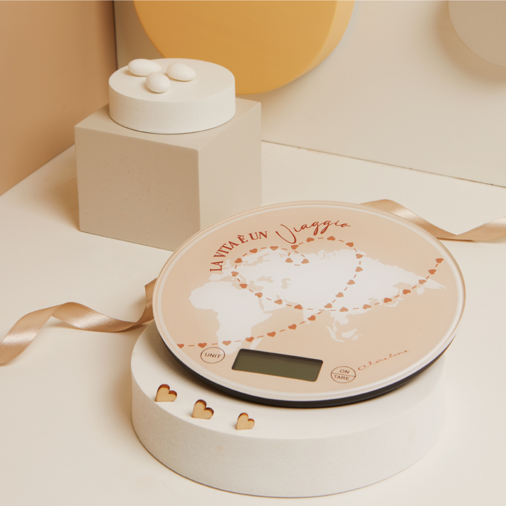 Bilancia digitale dal design elegante con decoro tema viaggio.