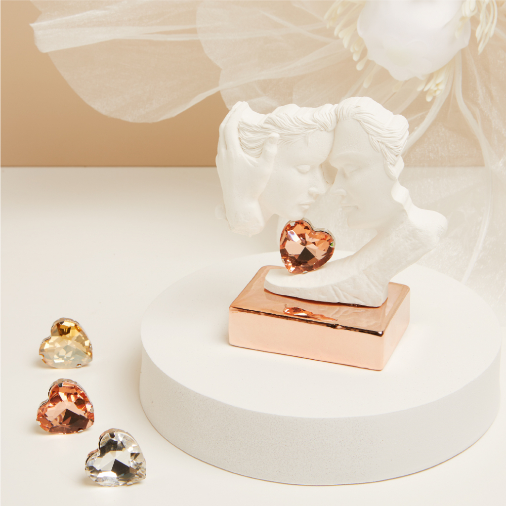 Questa affascinante scultura rappresenta una coppia di innamorati, catturando l’essenza dell’amore e della dolcezza. Realizzata con cura e attenzione ai dettagli, la scultura è arricchita da uno strass scintillante, abbinato al colore della base oro rosa, che aggiunge un tocco di eleganza e raffinatezza.