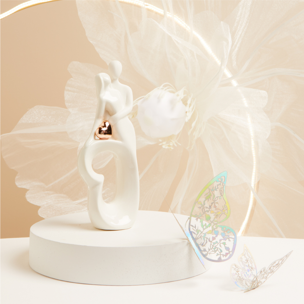 "Questa raffinata coppia di sposi in ceramica è un simbolo perfetto dell'amore e dell'unione, ideale come bomboniera per il matrimonio. Realizzata con cura artigianale, la coppia è scolpita con linee eleganti e dettagli che trasmettono delicatezza e affetto. Un piccolo cuoricino applicato al centro impreziosisce la composizione, aggiungendo un tocco di dolcezza e romanticismo. Questa bomboniera rappresenta un ricordo eterno del giorno speciale, un oggetto che gli ospiti conserveranno con piacere come segno tangibile dell’amore che hanno condiviso. Perfetto per aggiungere un tocco di classe e simbolismo a un evento indimenticabile."