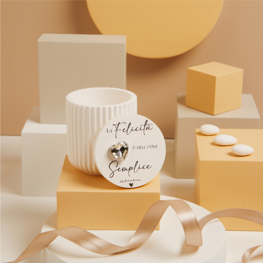 "Elegante e delicata, questa scatolina Toda è il perfetto simbolo di amore e semplicità. Realizzata con cura artigianale, è decorata con un'applicazione a forma di cuore su cui è incisa la frase 'La felicità è una cosa semplice', richiamando l'essenza di un amore puro e genuino. Perfetta come bomboniera di matrimonio, questa scatolina non solo custodisce i vostri dolci ricordi e i ringraziamenti per i vostri ospiti, ma può anche essere completata con una candela profumata. La fragranza delicata aggiunge un tocco di calore e intimità, trasformando il dono in un’esperienza sensoriale unica ed elegante."