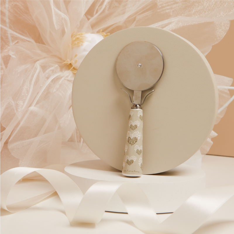 Tagliapizza in acciaio con manico in porcellana, decorato con graziosi motivi pastello, perfetto come bomboniera di matrimonio. Elegante e funzionale, è un accessorio di qualità che unisce praticità e stile, offrendo agli ospiti un ricordo originale e utile del vostro giorno speciale. Il design delicato e le tonalità morbide lo rendono un oggetto raffinato, ideale per arricchire ogni cucina con un tocco di classe e colore.