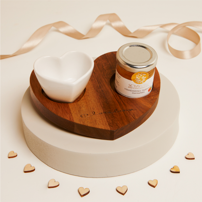 Perfetto per una bomboniera da matrimonio, questo set elegante include un vassoietto in legno a forma di cuore, simbolo d'amore e calore, accompagnato da una raffinata ciotolina in ceramica bianca. Completa il tutto un vasetto di marmellata disponibile in vari gusti o una crema alla nocciola, per un tocco di dolcezza personalizzata. Un dono unico e versatile, pensato per stupire gli ospiti con la sua semplicità e il suo fascino naturale.
