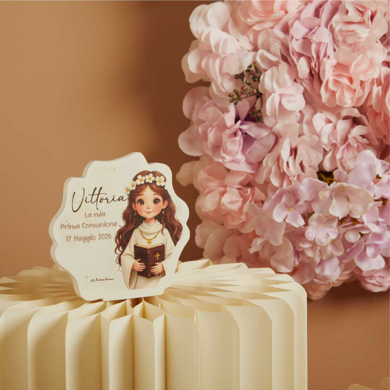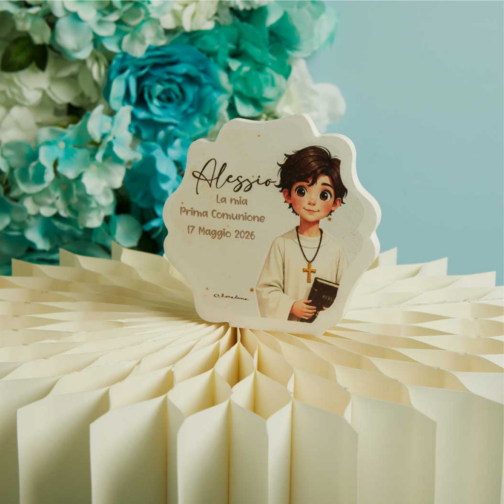 Icona bimbo/a che raffigura un bambino nel momento sacro della Comunione, è un ricordo prezioso e delicato. Personalizzabile con il nome del festeggiato e la data dell'evento, questa bomboniera diventa un pensiero speciale per amici e parenti, da conservare con affetto nel tempo. Un oggetto raffinato, che unisce la bellezza del design alla sacralità del momento, ideale come regalo per questa importante occasione.