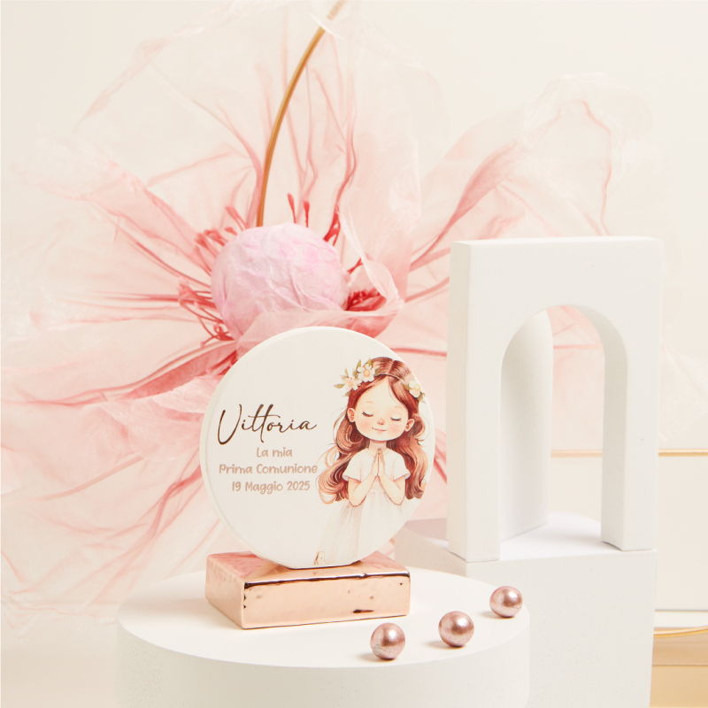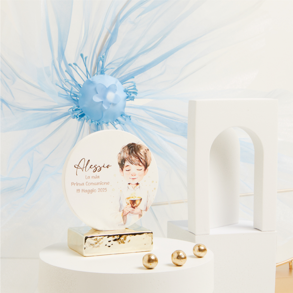 Icona tonda con base dorata, che raffigura un bambino nel momento sacro della Comunione, è un ricordo prezioso e delicato. Personalizzabile con il nome del festeggiato e la data dell'evento, questa bomboniera diventa un pensiero speciale per amici e parenti, da conservare con affetto nel tempo. Un oggetto raffinato, che unisce la bellezza del design alla sacralità del momento, ideale come regalo per questa importante occasione.