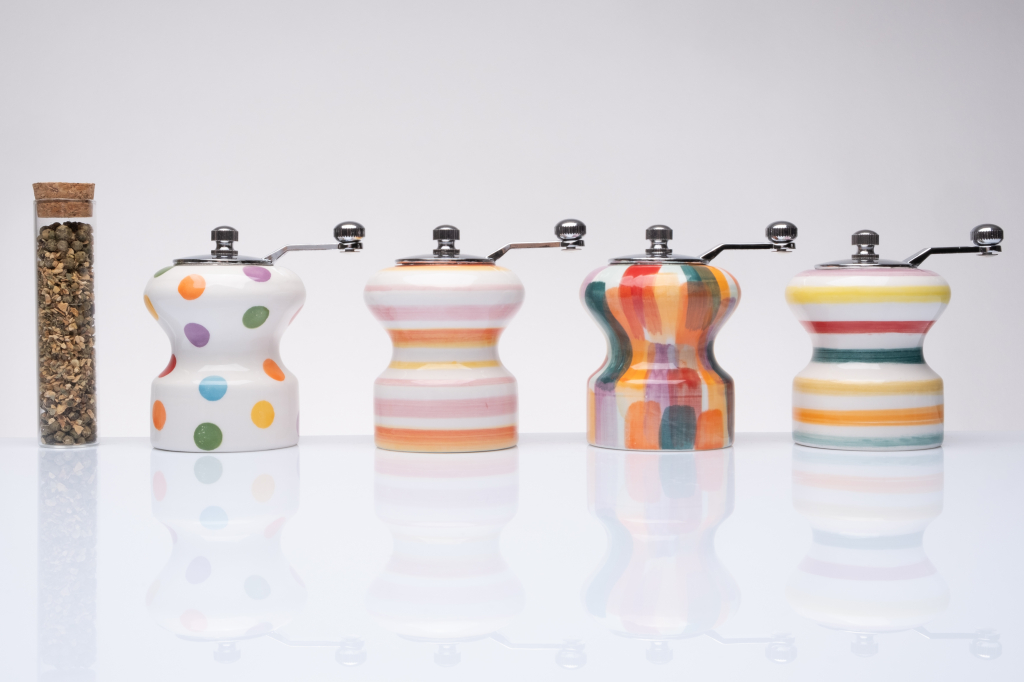 Macinapepe in Ceramica Dipinta a Mano con Provette di Pepe Gourmet – Set di 4 Colori Assortiti