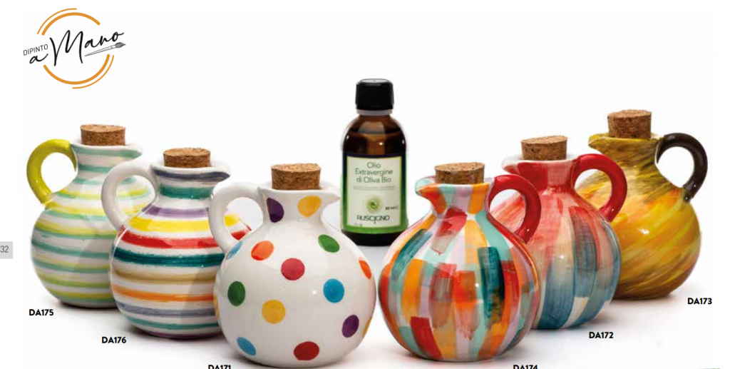 Oliera in Ceramica con Tappo in Sughero e Flaconino di Olio Aromatizzato da 50 ml Colori assortiti