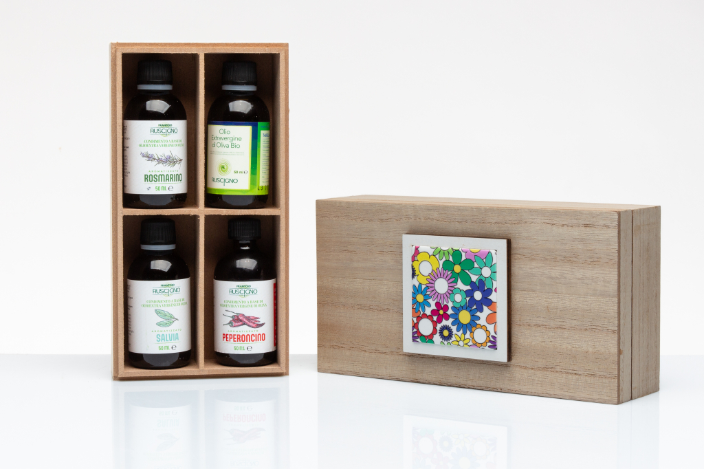 . All'interno, la scatola contiene quattro pregiati oli aromatizzati, ognuno in gusti assortiti, perfetti per esaltare i sapori della cucina mediterranea. Un'idea regalo unica che unisce estetica e gusto, ideale per matrimoni, battesimi, anniversari o altre occasioni speciali.