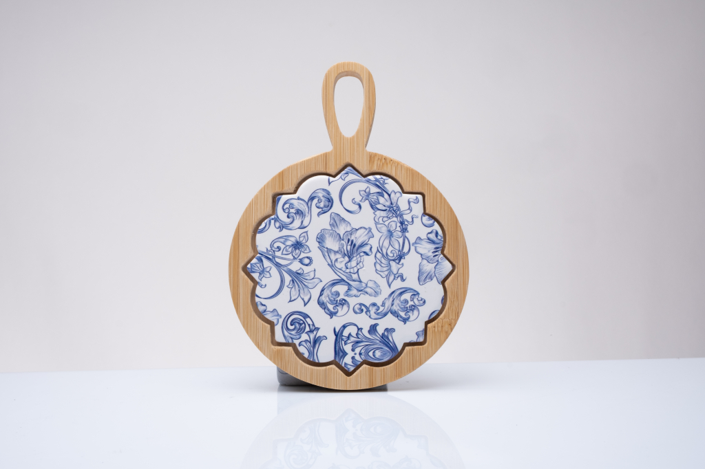 Elegante tagliere tondo in bambù, dotato di un pratico manico, con una base a forma di stella in ceramica decorata da un raffinato fregio. Perfetto per servire formaggi, affettati o per l'uso quotidiano in cucina, unisce funzionalità e stile. Ideale come bomboniera per matrimoni, battesimi o altre occasioni speciali, questo tagliere è un regalo unico e sofisticato.