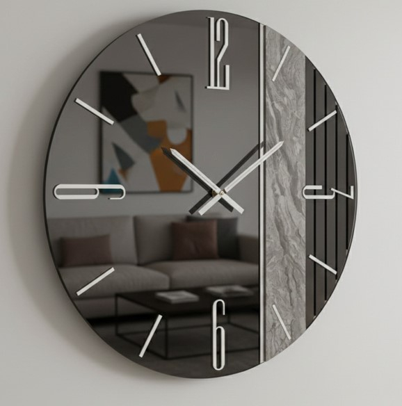 DESCRIZIONE L’orologio TIC TAK (Ø 80 cm) ridefinisce la decorazio ne murale attraverso un sofisticato gioco di contrasti. Il design si divide tra l’eleganza magnetica dello specchio e il rigore di una finitura materica opaca, impreziosito da ricercate lancette in metallo cromato. Un pezzo iconico, minimalista e di grande presenza scenica, ideale per i living più esclusivi. DESCRIPTION The TIC TAK wall clock (Ø 80 cm) redefines wall decor through a sophisticated interplay of contrasts. Its design balances the magnetic elegance of the mirror with the sleek precision of a matte textured finish, enhanced by refined chrome-plated metal hands. An iconic, minimalist statement piece designed to elevate the most exclusive interiors