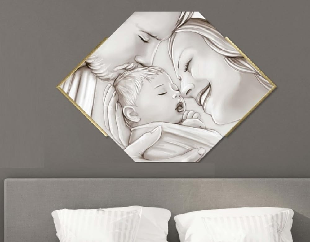 Quadro Capezzale Capoletto Moderno Sacra Famiglia in Legno forma a Rombo con cornice Ritoccato a Mano dimensioni 85 x 85 cm, Made in Italy (s1004)