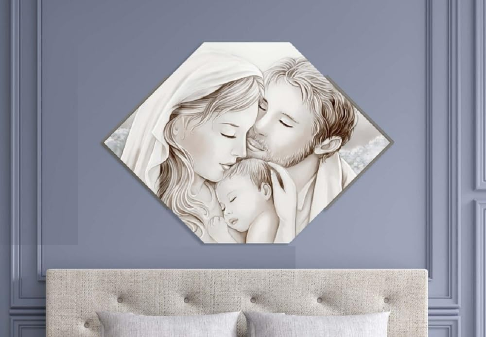 Quadro Capezzale Capoletto Moderno Sacra Famiglia in Legno forma a Rombo con cornice Ritoccato a Mano dimensioni 85 x 85 cm, Made in Italy
