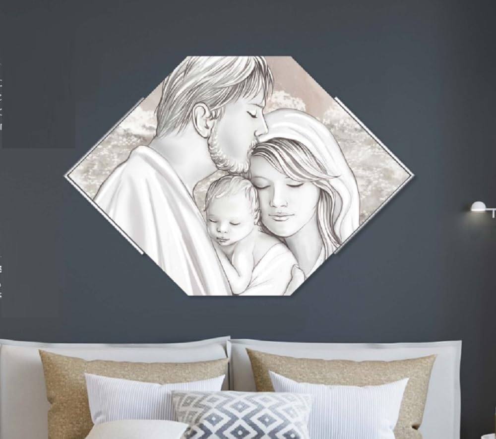 Quadro Capezzale Capoletto Moderno Sacra Famiglia in Legno forma a Rombo con cornice Ritoccato a Mano dimensioni 85 x 85 cm, Made in Italy