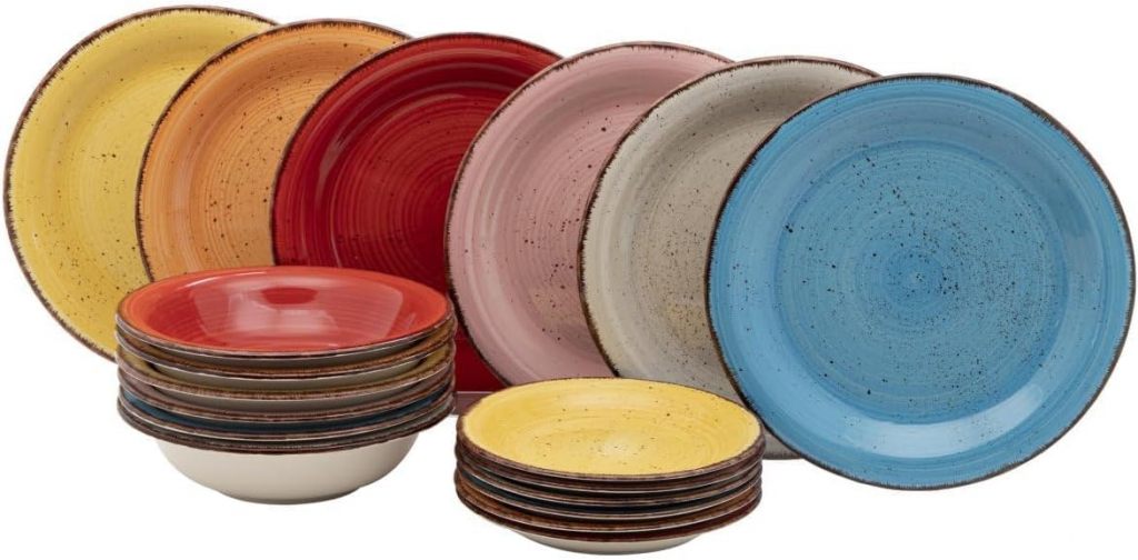 Servizio di piatti in gress porcellana, la forma dona una certa eleganza al servizio. Set di stoviglie che si applica perfettamente su qualsiasi tavolo o cucina. Design semplice, non passa mai fuori tempo, dona un tocco di colore e allegria alla tavola. Il servizio include 6 piatti piani (Ø 26 cm) , 6 piatti fondi (Ø 20.5 cm), 6 piatti da frutta (Ø 20 cm) . Adatto per l'uso quotidiano, nei ristoranti, riunioni di famiglia, feste, o come un bel regalo per l’anniversario, le nozze, ecc. Idoneo all’uso in microonde e lavabile in lavastoviglie.