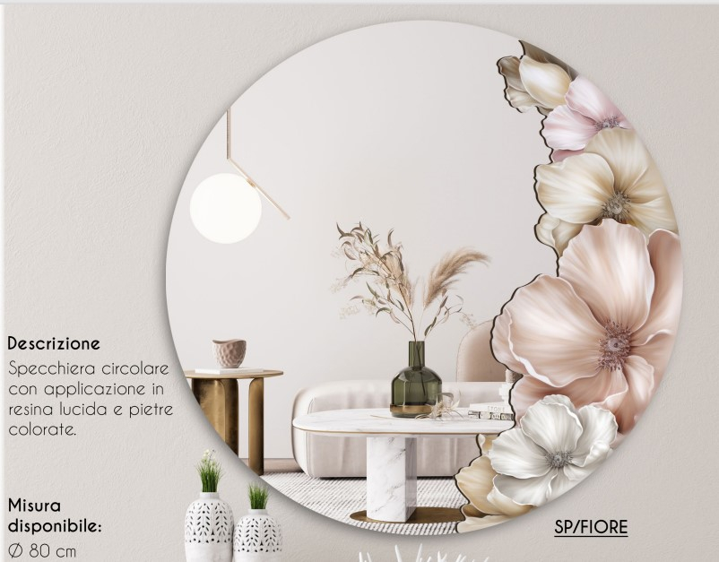 Specchio Tondo diametro 80 con applicazioni di resina lucida e pietre con finiture decorate a mano